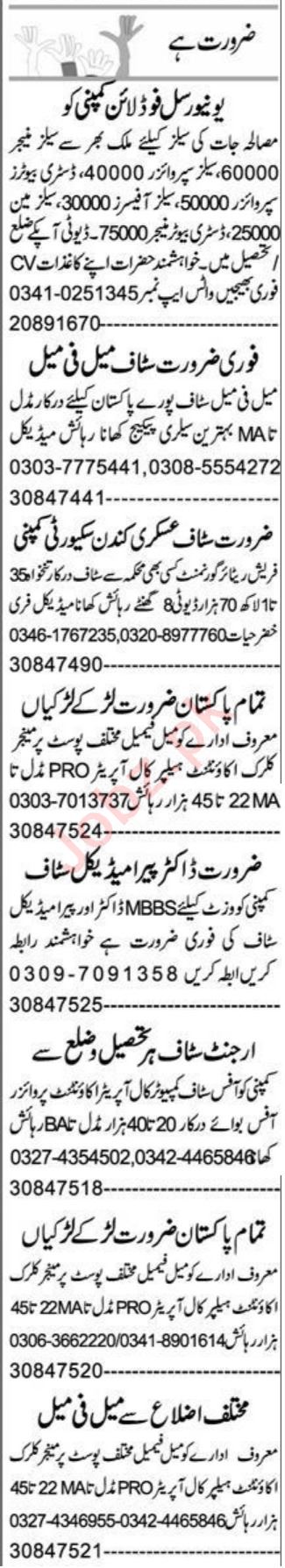 Private Company jobs advertisement dated about 3 April 2023 in daily Express Newspaper invites application for the vacant post of clerk, public relation officer, accountant, office staff, security guard, salesman, account supervisor, helper, distributor manager, call operator, office boy, mbbs doctor, paramedical staff, computer call operator, distributor supervisor, pro, sales manager, doctor, sales officer, manager and sales supervisor in Faisalabad, faisalabad Punjab Pakistan. Preferred Education is MBBS, Middle, Matric, Bachelor and Intermediate etc.