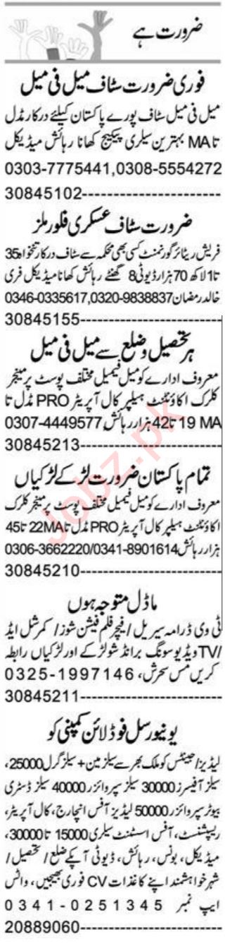 Vacant posts including sales supervisor, actor, clerk, helper, manager, receptionist, office incharge, accountant, office assistant, call operator, public relation officer, model, pro, office staff, sales girl, salesman, sales officer, sales distributor supervisor and female office staff are announced in Private Company Faisalabad, lahore Punjab Pakistan as per 6 March 2023 advertisement in daily Express Newspaper. Intermediate, Bachelor, Middle and Matric etc. educational qualification will be preferred.