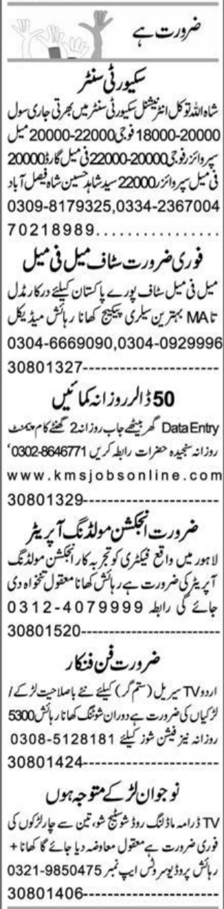 Vacant posts including Injection Molding Operator, Female Supervisor, Female Guard, Security Guard, Model, Supervisor, Data Entry Operator and Actor are announced in Private Company Faisalabad Punjab Pakistan as per 9 January 2022 advertisement in daily Express Newspaper. Candidates with Bachelor, Intermediate, Matric and Middle etc. educational background will be preferred.