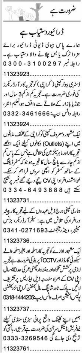 Private Company Jodia Bazar Karachi, karachi Sindh Pakistan invites applications from eligible candidates for the post of customer dealer, security guard, order booker, business manager, driver, cctv operator, bus driver, salesman, truck driver, dental surgeon and sales order booker as per advertisement of June 2, 2025 published in daily Express Newspaper. Candidates with Intermediate, DAE, Matric, Middle, BDS, Bachelor and BA etc. educational background will be preferred.