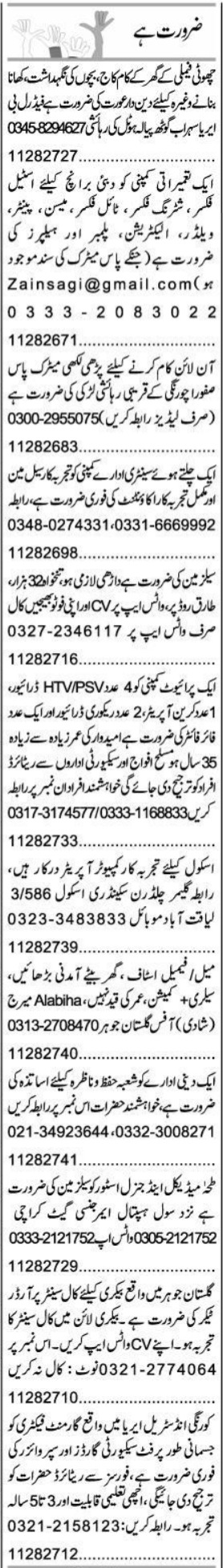 Private Company jobs advertisement dated about 12 February 2024 in daily Express Newspaper invites application for the vacant post of computer operator, house servant, plumber, care taker, painter, psv driver, helper, recovery driver, masi, nazra teacher, steel fixer, tile fixer, htv driver, electrician, welder, security guard, house maid, salesman, supervisor, mason, accountant, teacher, order taker, shuttering carpenter, aya, driver and fire fighter in Karachi, karachi Sindh Pakistan. Candidates with Middle, Intermediate, BA, Matric, I.com, Bachelor and B.com etc. educational background will be preferred.