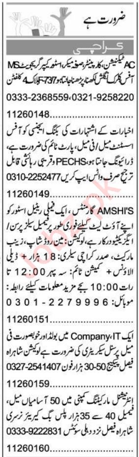 Private Company Karachi, karachi Sindh Pakistan invites applications from eligible candidates for the post of ac technician, sales person, office clerk, driver, carpenter, office assistant, clerk, marketing officer, personal secretary, store keeper and sales executive as per advertisement of June 12, 2023 published in daily Express Newspaper. Bachelor, Intermediate, Middle, DAE, BA and Matric etc. educational qualification will be preferred.