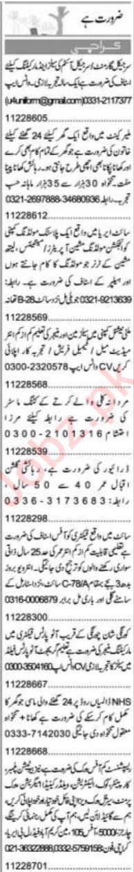 Private Company Karachi, karachi Sindh Pakistan invites applications from eligible candidates for the post of maid, helper, masi, office staff, salesman, electrician, marketing manager, marketing staff, sales staff, turner, plumber, carpenter, ltv driver, injection molding machine operator, welder, lathe machine operator, beautician, cutting master, driver, cook and sales manager as per advertisement of August 22, 2022 published in daily Express Newspaper. Candidates with Middle, Intermediate, Matric and Bachelor etc. educational background will be preferred.