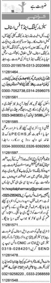 Private Company Karachi, karachi Sindh Pakistan invites applications from eligible candidates for the post of tailor master, social media marketing designer, receptionist, social media expert, tailor, fashion designer, carpenter, marketing staff, sales staff, order booker, assistant, computer operator, manager, sales manager, salesman, painter, supervisor, patient care, pharmacy technician, house servant, primary teacher, store keeper, teacher and social media marketing officer as per advertisement of January 29, 2024 published in daily Express Newspaper. Persons with Matric, BA, Middle, B.com, Bachelor, DAE, Intermediate and I.com etc. education can apply.