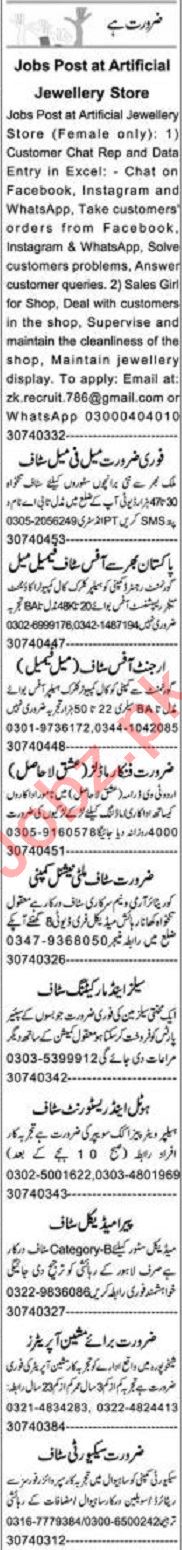 Assistant Supervisor, Account Manager, Teacher, English Teacher, Chemistry Teacher, Physics Teacher, Coordinator, Biology Teacher, Maths Teacher, Urdu Teacher, Art Teacher, English Teacher, Office Assistant, Salesman, Marketing Staff, Sales Staff, Computer Operator, Sales Manager, Sales Officer, Nurse, Business Manager, Security Guard, Gynecologist, Lawyer, Assistant Accountant, Waiter, Batman needs in well developed companies.