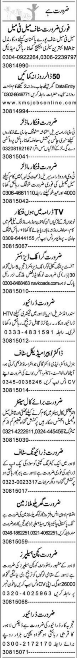 Private Company jobs advertisement dated about 9 May 2022 in daily Express Newspaper invites application for the vacant post of chef, htv driver, ophthalmologist, cook, model, general doctor, driver, ltv driver, doctor, office staff, kitchen helper, office boy, call center agent, graphic designer, helper, gynecologist, actor, house maid, lady doctor, dispenser, data entry operator and maid in Lahore, lahore Punjab Pakistan. Persons with Intermediate, Bachelor, Matric and Middle etc. education can apply.