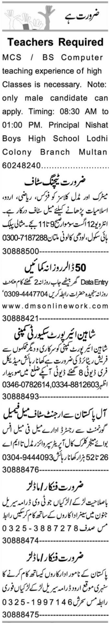 Vacant posts including security guard, call operator, actor, data entry operator, model, islamiat teacher, clerk, security staff, teacher, computer teacher, manager, supervisor, office boy, physics teacher, urdu teacher and mathematics teacher are announced in Private Company Multan, multan Punjab Pakistan as per 12 August 2024 advertisement in daily Express Newspaper. Intermediate, Matric, Middle, B.ed, MA, Bachelor, BA, M.sc and MCS etc. educational qualification will be preferred.
