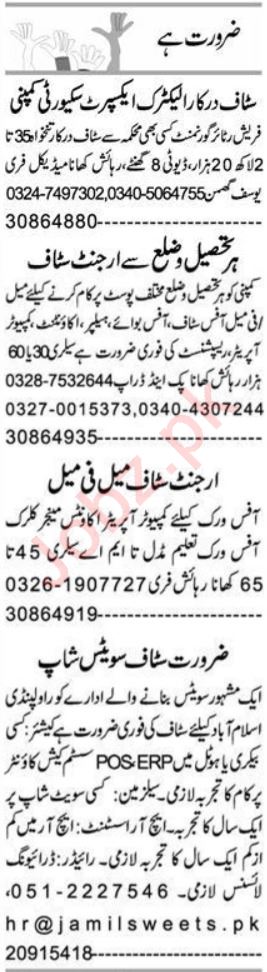 Bachelor, Intermediate, BA, B.com, I.com, Matric and Middle etc. educational qualification will be preferred.