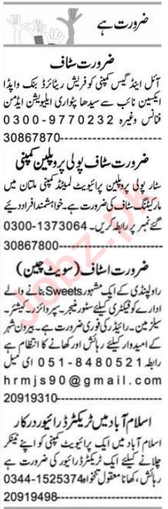 Vacant posts including salesman, cashier, office staff, store manager, htv driver, foreman, rider, driver, tractor driver, supervisor and marketing staff are announced in Private Company Multan, islamabad and rawalpindi Punjab Pakistan as per 18 December 2023 advertisement in daily Express Newspaper. Preferred Education is BA, Matric, Bachelor, B.com, Middle and Intermediate etc.