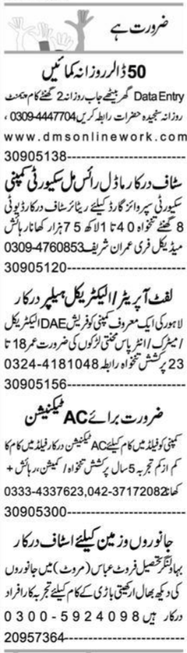 Private Company Multan, multan Punjab Pakistan invites applications from eligible candidates for the post of electrical helper, ac technician, data entry operator, field worker, security guard, farm worker, security supervisor guard and lift operator as per advertisement of January 6, 2025 published in daily Express Newspaper. Preferred Education is Intermediate, Middle, Bachelor, DAE, BA and Matric etc.