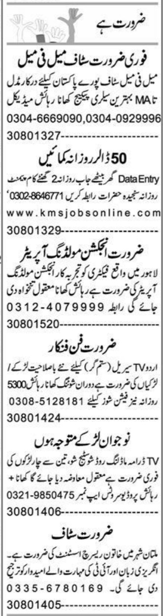 Private Company Lahore Punjab Pakistan invites applications from eligible candidates for the post of Research Assistant, Injection Molding Operator, Model, Actor and Data Entry Operator as per advertisement of January 9, 2022 published in daily Express Newspaper. Candidates with Intermediate, Bachelor, Matric and Middle etc. educational background will be preferred.