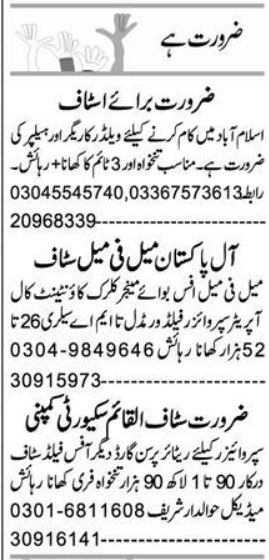 Private Company Peshawar, islamabad Khyber Pakhtunkhwa KPK Pakistan invites applications from eligible candidates for the post of security guard, call operator, welder, helper, supervisor, office boy, clerk, worker, accountant, manager and field worker as per advertisement of April 21, 2025 published in daily Express Newspaper. Candidates with Intermediate, Bachelor, BA, Middle and Matric etc. educational background will be preferred.