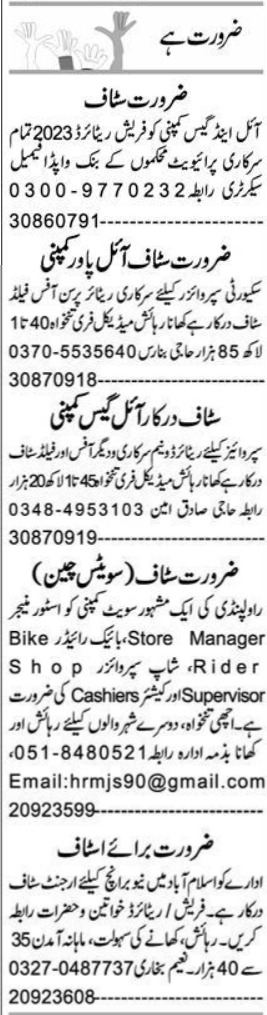 Private Company Peshawar, rawalpindi and islamabad Khyber Pakhtunkhwa KPK Pakistan invites applications from eligible candidates for the post of office staff, female secretary, secretary, cashier, field staff, store manager, supervisor, bike rider, shop supervisor and security supervisor as per advertisement of January 29, 2024 published in daily Express Newspaper. Candidates with Bachelor, Middle, Matric, Intermediate and BA etc. educational background will be preferred.