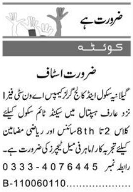 Vacant posts including science teacher, female teacher, mathematics teacher and teacher are announced in Private School Quetta, quetta Balochistan Pakistan as per 15 September 2025 advertisement in daily Express Newspaper. Bachelor and Master etc. educational qualification will be preferred.