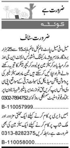 Vacant posts including banker, marketing officer, labor, social media worker, insurance agent, ngo worker, teacher, salesman and polio worker are announced in Private Company Quetta, quetta Balochistan Pakistan as per 23 September 2024 advertisement in daily Express Newspaper. Persons with Matric, Bachelor, Intermediate, Middle and BA etc. education can apply.