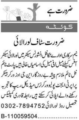 Takaful Company invites applications for job positions advertised in daily Express dated 26 May 2025 for following vacancies in Loralai, loralai Balochistan Pakistan.
