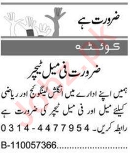 Private School jobs advertisement dated about 27 May 2024 in daily Express Newspaper invites application for the vacant post of english language teacher, mathematics teacher, teacher and female teacher in Quetta, quetta Balochistan Pakistan. Master, BA, M.sc, MA and Bachelor etc. educational qualification will be preferred.