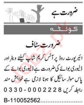 Vacant posts including waiter and delivery boy are announced in Ice Cream Company Quetta, quetta Balochistan Pakistan as per 1 August 2022 advertisement in daily Express Newspaper. Persons with Middle, Matric and Intermediate etc. education can apply.