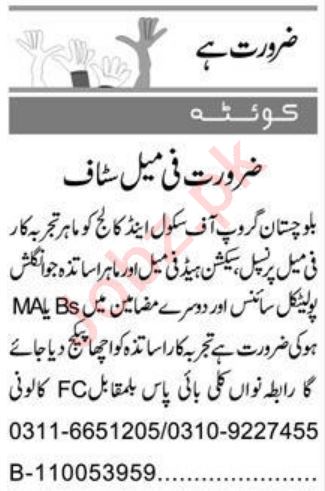 Balochistan Group of Colleges BGC Quetta, quetta Balochistan Pakistan invites applications from eligible candidates for the post of section head, principal, english teacher, teacher and political science teacher as per advertisement of February 6, 2023 published in daily Express Newspaper. Preferred Education is Bachelor, Master and Intermediate etc.