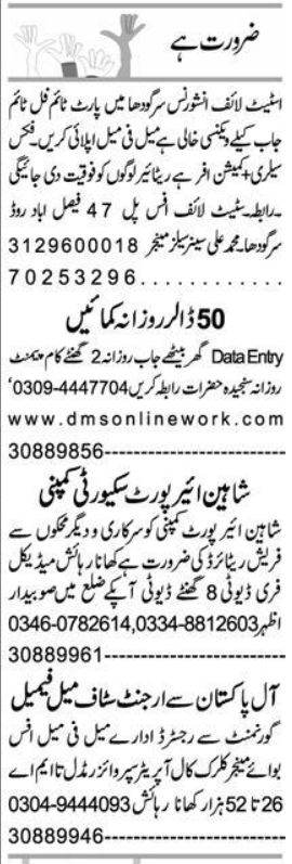Private Company Sargodha, sargodha Punjab Pakistan invites applications from eligible candidates for the post of data entry operator, clerk, insurance agent, security staff, call operator, manager, security guard, supervisor and office boy as per advertisement of August 26, 2024 published in daily Express Newspaper. Candidates with Bachelor, Intermediate, BA, Middle, Matric and DAE etc. educational background will be preferred.