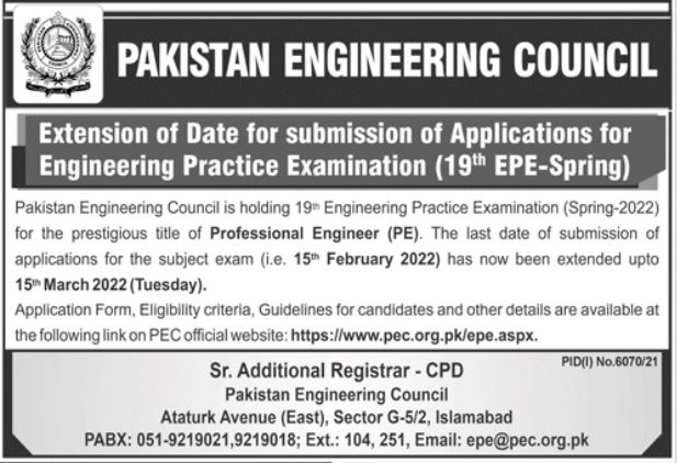 Pakistan Engineering Council Islamabad, islamabad Islamabad Pakistan invites applications from eligible candidates for the post of professional engineer practice examination as per advertisement of March 3, 2022 published in daily Jang Newspaper. B.E etc. educational qualification will be preferred.