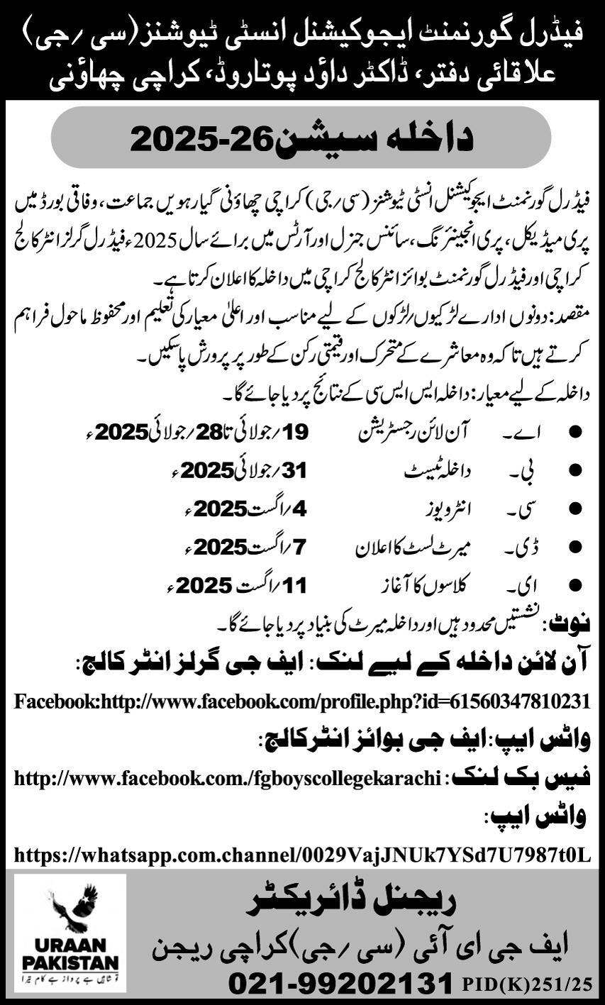 Federal Government Educational Institutions has announced admissions 2025 for FA, FSC . Federal Government Educational Institutions Karachi Sindh Pakistan welcomes students to apply for admissions in academic year 2025 in Science College. Students who want to enroll for academic session 2025 in qualification and admission criteria for Government institute can apply till last date. Read newspaper ad for exact details.