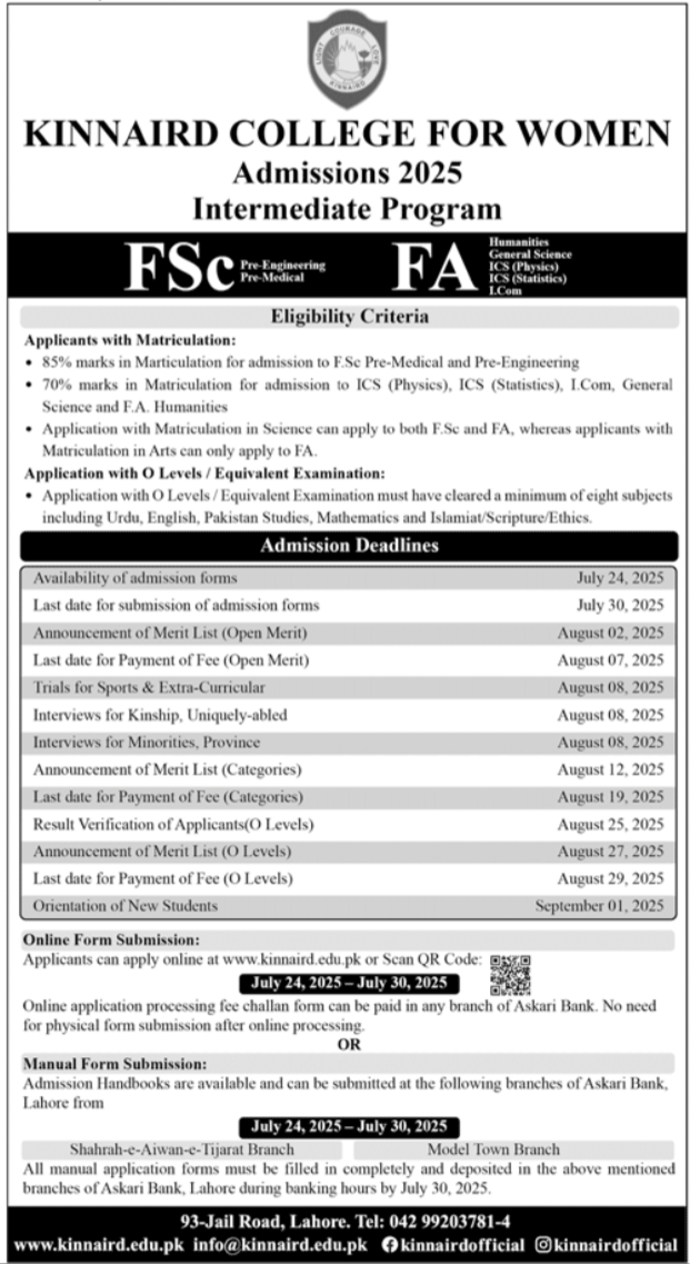FA, FSC Admissions 2025 open in Kinnarid College for Women