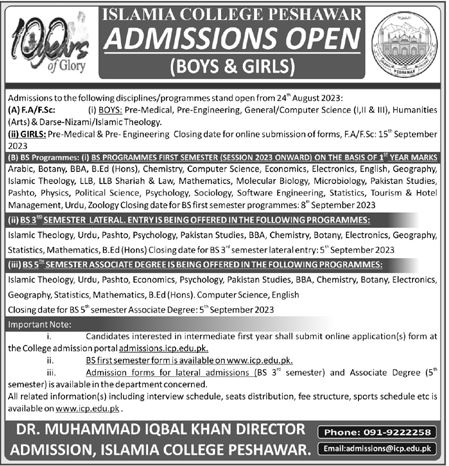 Islamia College has announced admissions 2023 for FA, FSc, BS Program. Islamia College Peshawar Khyber Pakhtunkhwa KPK Pakistan welcomes students to apply for admissions in academic year 2023 in Science College. Students for admissions in Intermediate and BS can apply for online or campus classes as per Private institute criteria till admission closing date September 5, 2023. Read newspaper ad for exact details.