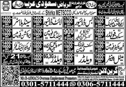 Green Line Human Resource Manpower invites applications for job positions advertised in daily Express dated 20 May 2025 for following vacancies in Riyadh, dammam Saudi Arabia.