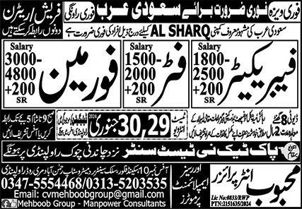 Mehboob Enterprises Overseas Employment Promoters is looking for candidates for following posts as per job advertisement published in daily Express Newspaper of January 17, 2024 for location Dammam, jeddah Saudi Arabia: