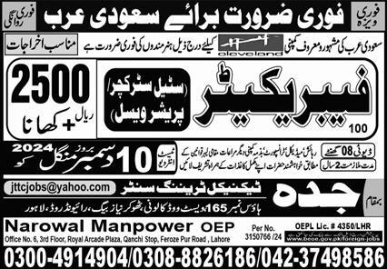 Narowal Manpower Bureau invites applications for job positions advertised in daily Express dated 9 December 2024 for following vacancies in Saudi Arabia, saudi arabia Saudi Arabia.