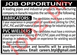 Fabricator & PVC Welder Jobs In Manufacturing Company