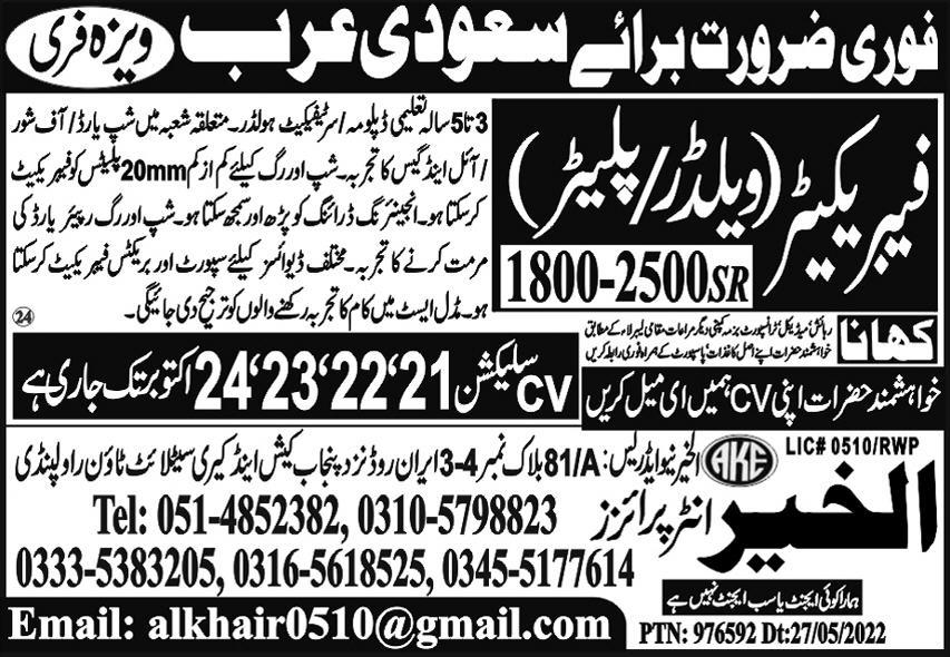 Al Khair Enterprises invites applications for job positions advertised in daily Express dated 21 October 2022 for following vacancies in Riyadh, jeddah Saudi Arabia.