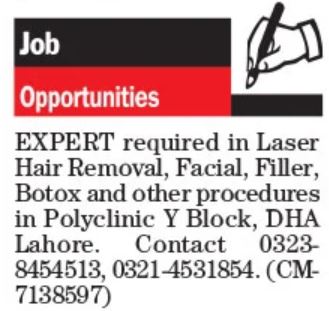 Laser Skin Clinic jobs advertisement dated about 13 October 2023 in daily The News Newspaper invites application for the vacant post of laser hair removal expert, facial expert and botox expert in Lahore, lahore Punjab Pakistan. Preferred Education is Intermediate and Matric etc.