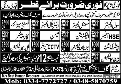 Gulf International is looking for candidates for following posts as per job advertisement published in daily Express Newspaper of November 11, 2025 for location Doha, doha Qatar: