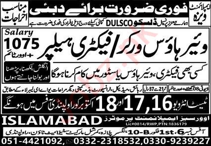 Islamabad Overseas Employment Promoters UAE, dubai UAE invites applications from eligible candidates for the post of warehouse worker and factory helpeer as per advertisement of October 15, 2023 published in daily Express Newspaper. Educational qualifications required Middle and Primary etc.