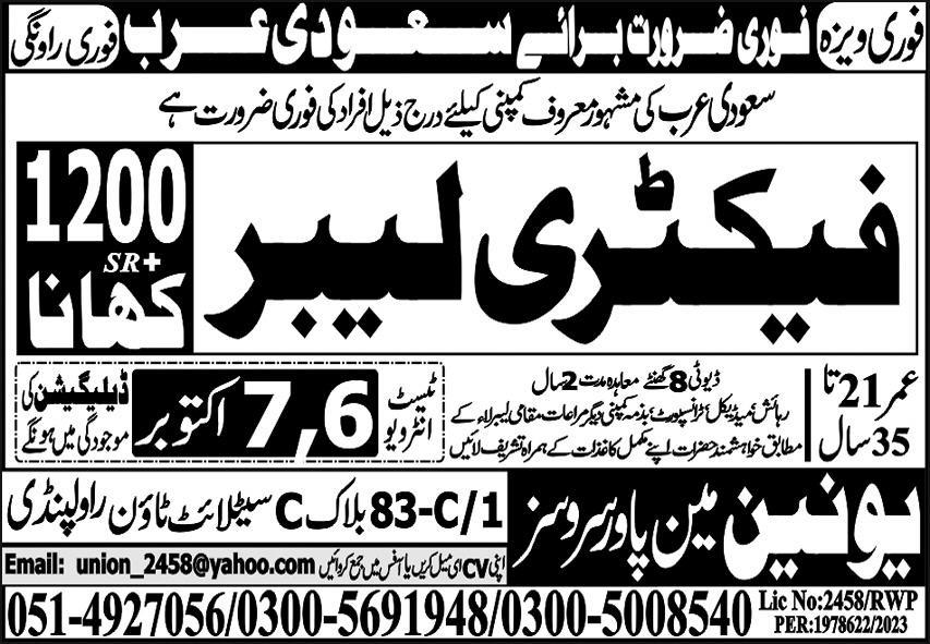 Union Manpower Services Makkah, jeddah Saudi Arabia invites applications from eligible candidates for the post of factory labor and labor as per advertisement of October 5, 2023 published in daily Express Newspaper. Persons with Matric etc. education can apply.