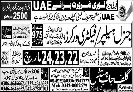 Vacant posts including factory worker and general helper are announced in Gulf Job Hunts Manpower Services Abu Dhabi, sharjah UAE as per 21 March 2023 advertisement in daily Express Newspaper. Middle and Matric etc. educational qualification will be preferred.