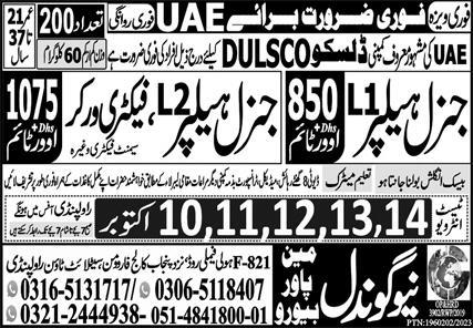 New Gondal Manpower Bureau jobs advertisement dated about 10 October 2023 in daily Express Newspaper invites application for the vacant post of factory worker and general helper in Sharjah, abu dhabi UAE. Educational qualifications required Matric and Intermediate etc.
