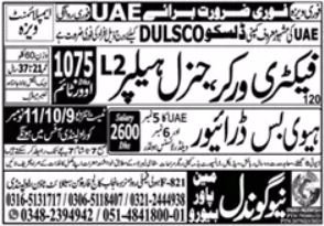 New Gondal Manpower Bureau invites applications for job positions advertised in daily Dunya dated 8 November 2023 for following vacancies in UAE, uae UAE.