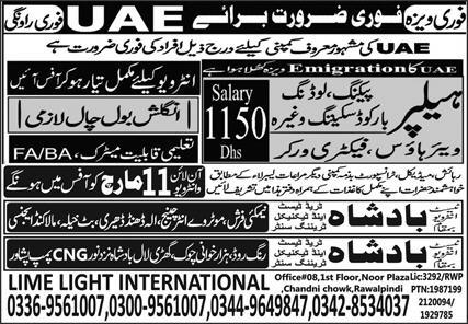 BTTC Badshah Overseas Employment Promoters jobs advertisement dated about 9 March 2024 in daily Express Newspaper invites application for the vacant post of helper, warehouse worker and factory worker in Abu Dhabi, sharjah UAE. Preferred Education is Matric, Middle and Intermediate etc.