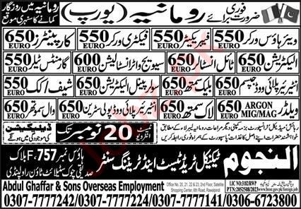 Vacant posts including fabricator, electrician, lock smith, carpenter, black smith, factory worker, welder, solar pannel electrician, cook, warehouse worker and chef are announced in Al Najoom Technical Trade Test Training Center Europe, romania Europe as per 19 November 2023 advertisement in daily Express Newspaper. Candidates with Middle, Primary and Matric etc. educational background will be preferred.