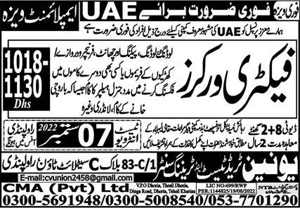 Vacant posts including factory worker are announced in Union Trade Test and Training Center Abu Dhabi, sharjah UAE as per 3 September 2022 advertisement in daily Express Newspaper. Matric and Middle etc. educational qualification will be preferred.