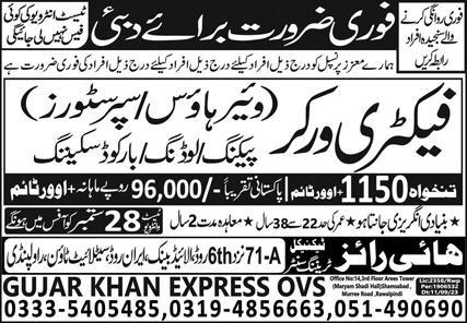 Gujar Khan Express jobs advertisement dated about 27 September 2023 in daily Express Newspaper invites application for the vacant post of factory worker, super store worker and warehouse worker in Dubai, abu dhabi Dubai. Preferred Education is Matric and Intermediate etc.