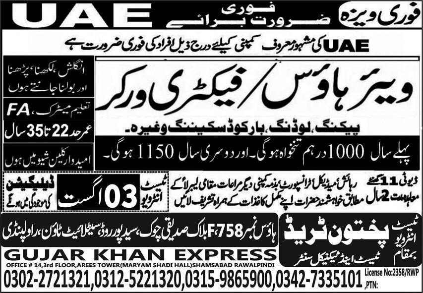 Gujar Khan Express is looking for candidates for following posts as per job advertisement published in daily Express Newspaper of August 1, 2024 for location Abu Dhabi, sharjah UAE: