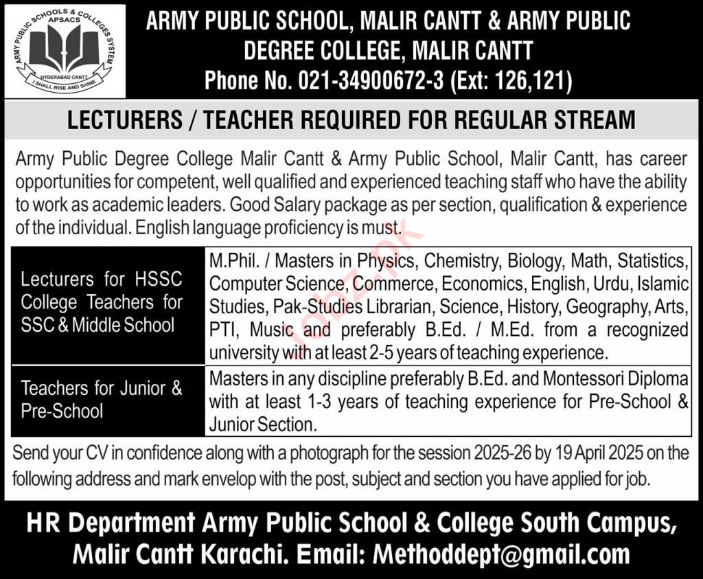 Army Public School is looking for candidates for following posts as per job advertisement published in daily Express Newspaper of April 13, 2025 for location Cantt Karachi, karachi Sindh Pakistan: