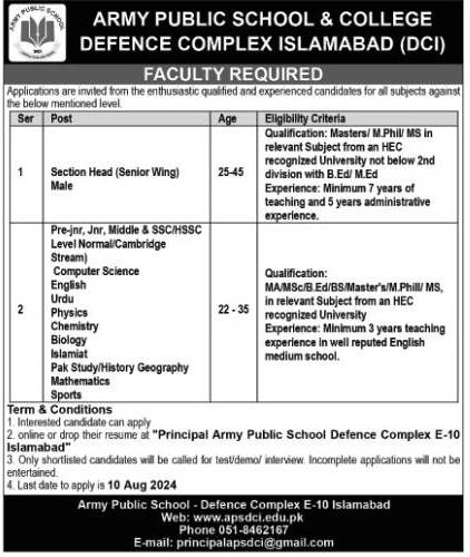 Army Public School & College APS&C invites applications for job positions advertised in daily Nation dated 3 August 2024 for following vacancies in Islamabad, islamabad Islamabad Pakistan.