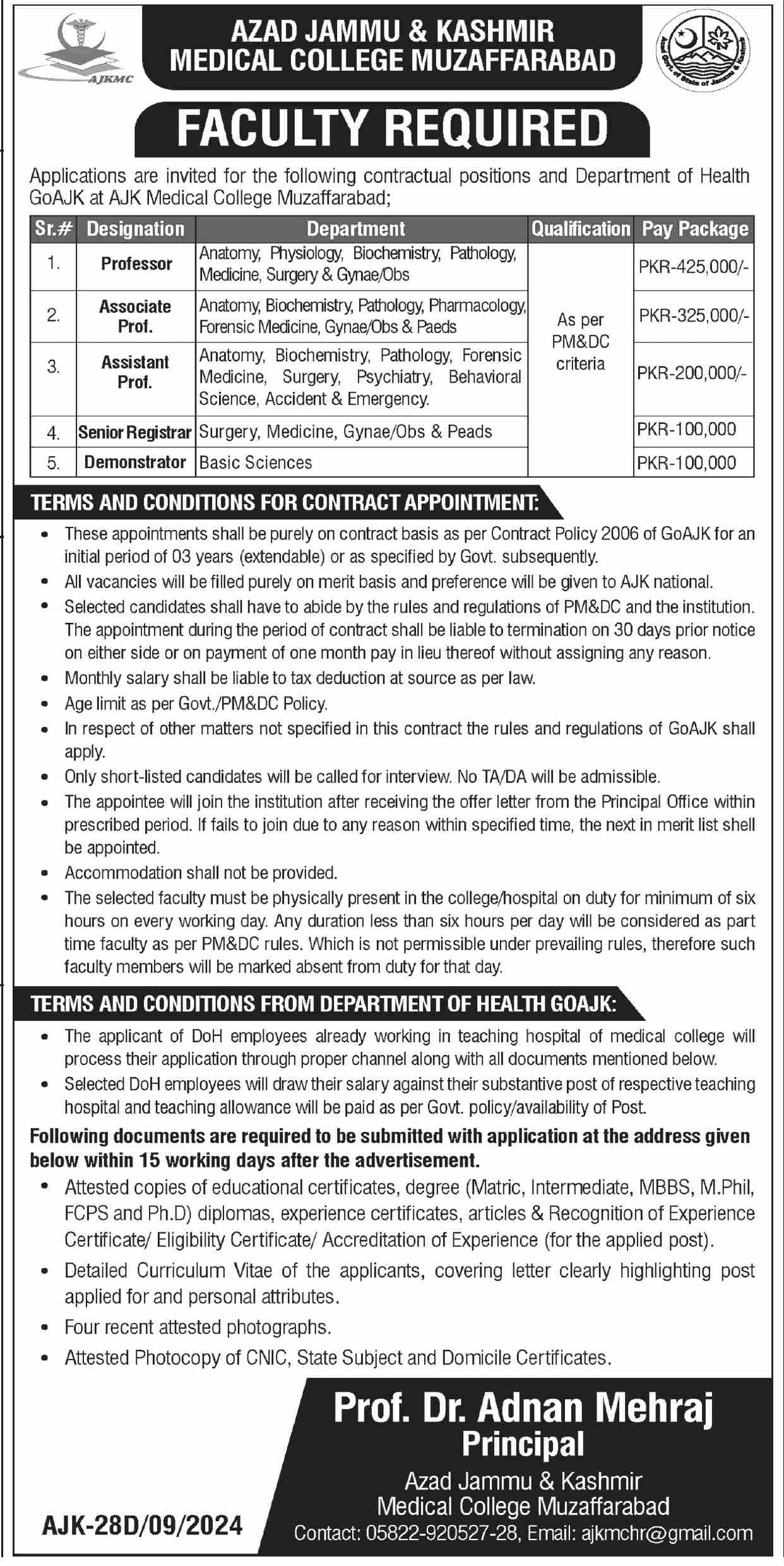 Azad Jammu & Kashmir Medical College jobs advertisement dated about 7 September 2024 in daily Dawn Newspaper invites application for the vacant post of associate professor, registrar, professor, assistant professor and demonstrator in Muzaffarabad, muzaffarabad AJK Pakistan. MBBS and Others etc. educational qualification will be preferred.