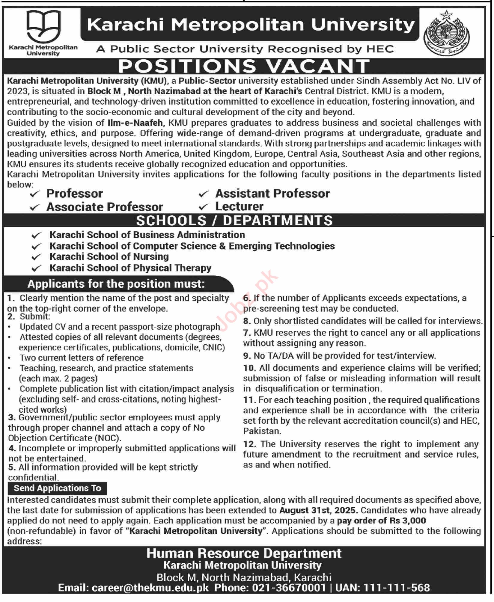 Karachi Metropolitan University KMU latest Government Education jobs and others can be applied till 31 August 2025 or as per closing date in newspaper ad. Read complete ad online to know how to apply on latest Karachi Metropolitan University KMU job opportunities.