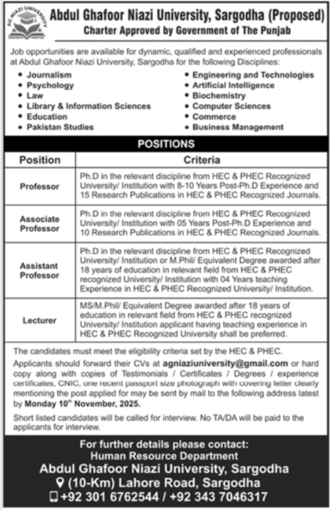 Abdul Ghafoor Niazi University is looking for candidates for following posts as per job advertisement published in daily Jang Newspaper of November 2, 2025 for location Sargodha, sargodha Punjab Pakistan: